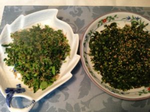 写真は大小の大根五本分の葉の量です。大根の葉っぱにはアクがありませんので、扱いが簡単です。よく洗って微塵切りにします。この微塵切りは結構ストレス解消になるものです。